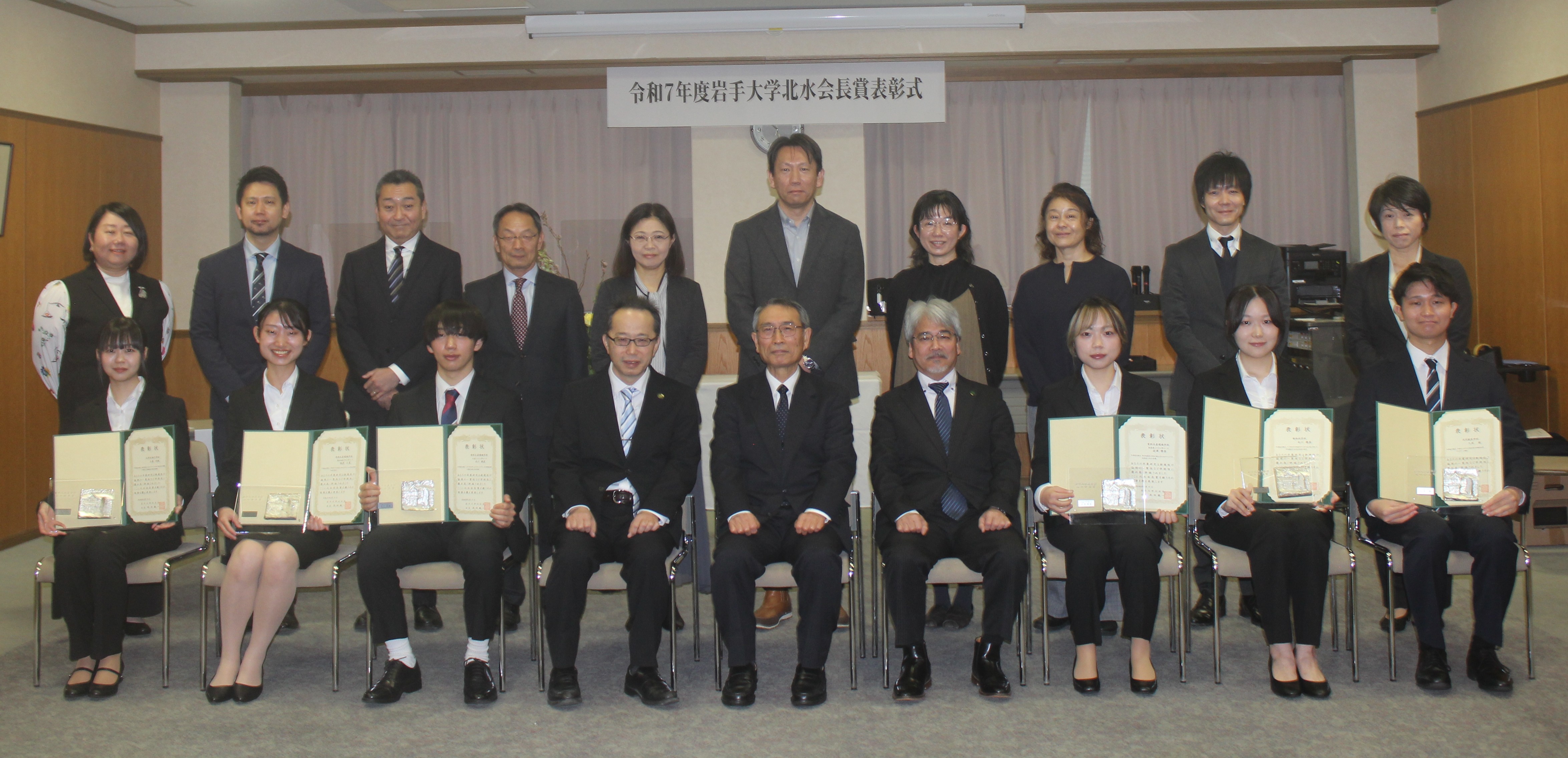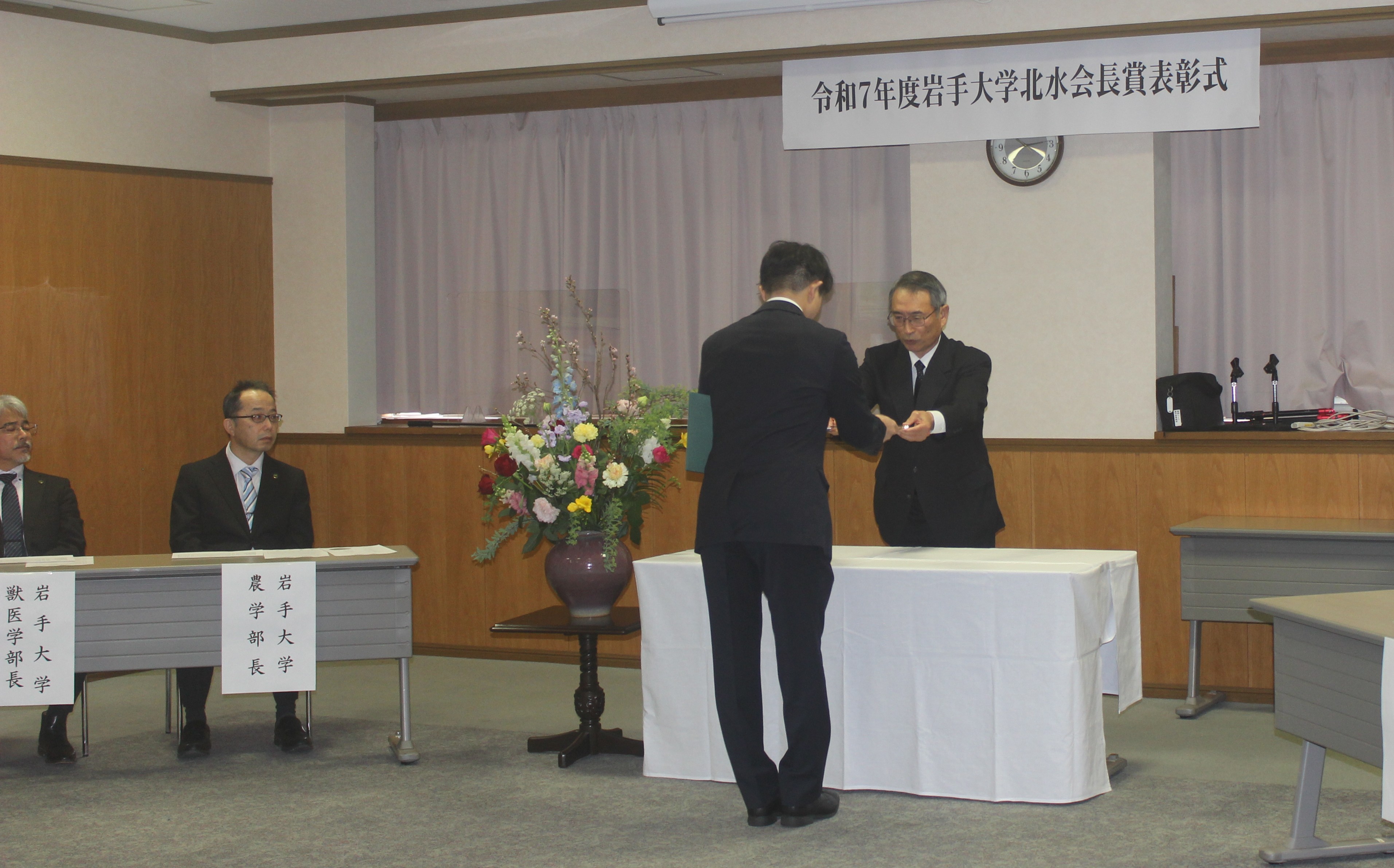 | 【お知らせ】 *令和7年度北水会長賞(第20回) 授賞式を開催しました。 令和8年3月19日、令和7年度北水会長賞第20回授賞式を開催しました。 北水会長賞は、岩手大学農学部の各学科・コースの卒業論文の中で最も優秀な論文に贈られる名誉ある賞で、平成18年度に制定され、今年度で20回となります。(北水会長賞について詳しくは、下記をご覧ください。)