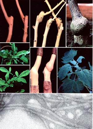 | リンゴ高接病 リンゴ高接病は、リンゴの台木が衰弱し、やがてリンゴ樹全体が枯れてしまう病気です。この病気は日本特有ですが、その理由はわが国でリンゴの台木として使われているマルバカイドウやミツバカイドウなどが、病原ウイルスであるACLSV、ASGV、ASPVに感受性のためです。栽培リンゴ品種では、これらのウイルスが感染しても通常は病徴は現れません(潜在感染)。 左図(上段左と真中)はASGVによって接木部が壊死を起こしている様子です。ASGVはリンゴ以外に、カンキツにも感染して接木部異常症を引き起こします(上段右、中段真中)。 ACLSV、ASGV、ASPVは、いずれもひも状のウイルスで(左図下段はASGV)、長さが600〜800nmです。われわれの研究室ではこれらウイルスゲノムの全塩基配列を解析し、ゲノム構造を明らかにしました(下図)。分類学的には、ACLSVはトリコウイルス属、ASGVはカピロウイルス属、ASPVはホベアウイルス属に所属します。 現在、病原性の強いウイルス株と弱い株では遺伝子の中のどこが違うのかという病原性の解析、またウイルス本体やウイルスが持っている遺伝子をウイルス病の防除に利用しようというテーマで研究を進めています。 |