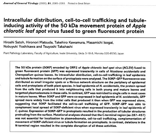 | リンゴクロロティックリーフスポットウイルス(ACLSV)のゲノムがコードしている細胞間移行タンパク質(50KP)の機能を解析するために、50KPにクラゲ由来のグリーン蛍光タンパク質(GFP)を融合した遺伝子を植物細胞で発現させ、50KPの細胞内での分布とプラズモデスマータへの局在、また50KP自身が細胞間移行能を持つことを明らかにしました(左図、詳しくは下の論文)。 また、ACLSVの50KPを発現するトランスジェニック植物がブドウえそ果ウイルス(GINV)の感染に対して強度の抵抗性を示すことを発見しました(下の論文)。現在、ウイルスが持つ細胞間移行タンパク質を用いたウイルス抵抗性植物の開発に取り組んでいます。 |