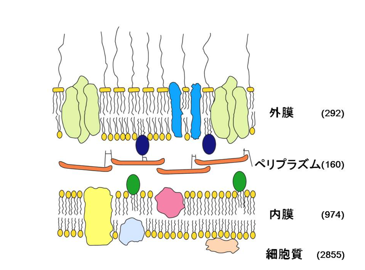 大腸菌の染色体DNAは約465万塩基対あり、4千あまりのタンパク質をコードすると考えられています。その中で、細胞質に局在するタンパク質は約7割の3千弱しかありません。残りの3割はタンパク質生合成の場である細胞質ではなく、外膜、ペリプラズム、内膜に輸送されています。一部の病原性大腸菌を除けば外膜を超えてまで放出されるタンパク質はありません。外膜、ペリプラズムに局在するタンパク質の種類は比較的少ないですが、一種あたりの発現量が非常に多いタンパク質があるため、発現レベルを比べたとき、外膜、ペリプラズム、内膜にそれぞれ10%ずつになります。そのため、タンパク質の種類、発現量どちらをとっても約30%のタンパク質は細胞質以外の場所に輸送されているわけです。