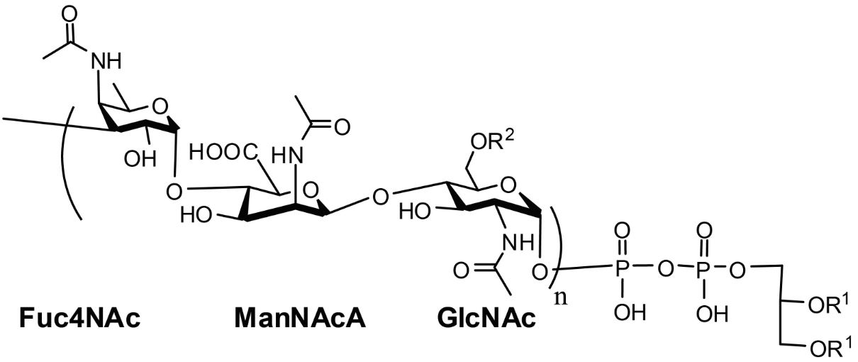 図4 MPIaseの構造。GlcNAcはNアセチルグルコサミン、ManNAcAはNアセチルマンヌロン酸、Fuc4NAcは4デオキシ4アセトアミドフコースを示す。R1はC16~C20の脂肪酸、R2はアセチル基またはOH基を示す。nは9~11の整数を示す。