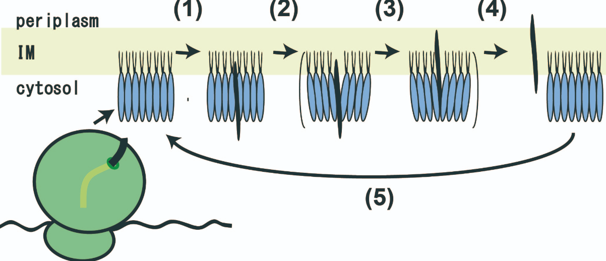 これだけで全てが説明できれば非常にすっきりとするのですが、実際にはもう少しバリエーションがあります。もし、膜タンパク質が図3中段のように親水的な領域をペリプラズム側にもっていれば、SecAという因子がさらに必要です。SecAはタンパク質膜透過に必要な因子でATPase活性を持っています。親水的な領域は、分泌タンパク質の膜透過と同様にSecAにより膜透過されます。しかし、この場合も途中までは上段と同じです。