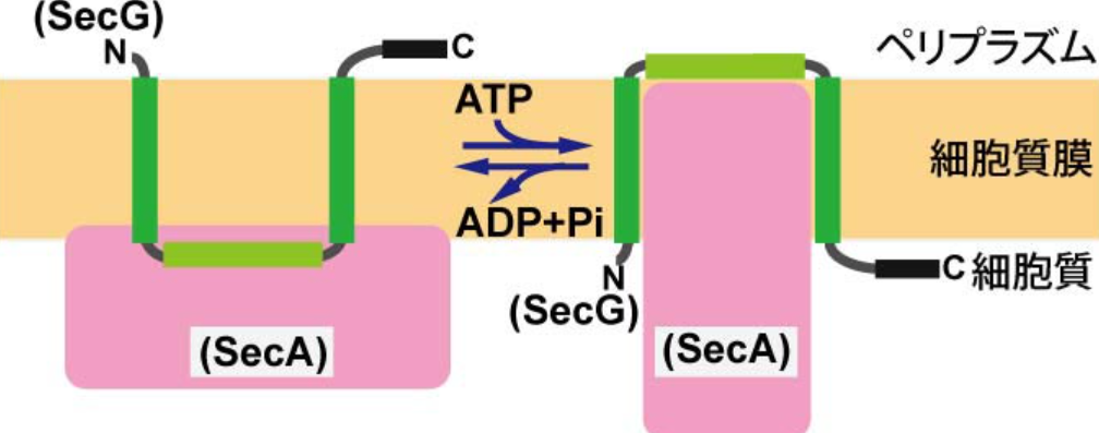 1996; EMBO J 1999; J Biol Chem 2007; 2012など)。SecAはATPase活性をもっているタンパク質で、ATPを加水分解しながら分泌タンパク質を細胞質からペリプラズムに押し出す働きをもっています。このピストンのようなSecAの構造変化に共役しながらSecGが構造変化するわけですが、そのとき膜を2回貫通するSecGは反転-回復を繰り返すわけです。膜タンパク質というのは予めその膜内配向性がアミノ酸配列によって決定されており、それは生涯変化することはないとされてきました。そのため、SecGの配向性反転は、他に例を見ない画期的な概念だったわけです。さて、最近明らかになったのは、SecG反転サイクルにはMPIaseが必須であることでした(PNAS,