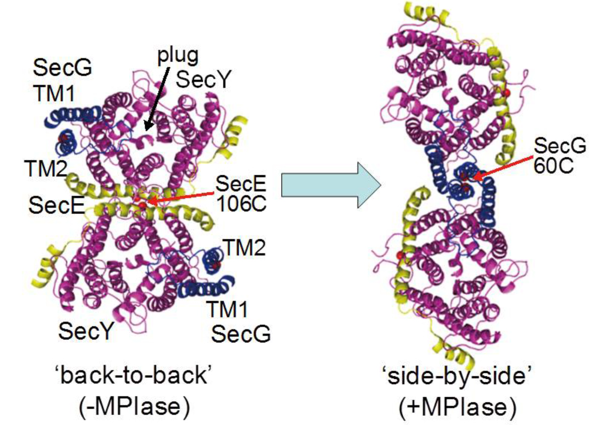 SecYEGを組み込んだリポソームにMPIaseを共存させると、SecYEGしかないときに比べて膜透過反応が10倍以上促進されます。その理由は、SecYEGの二量体構造がMPIaseの有無で全く異なることでした。SecYEGはきれいなX線結晶構造が明らかになっていて、図7の左のような構造をしています。SecEが二量体の接触面にあり、「Back-to-back構造」と呼ばれています。それに対して、MPIaseが存在するとSecYEGの二量体構造が大きく変化して、図7右のような構造に変化します。我々はこれを「Side-by-side構造」と呼んでいます。SecYEGがSide-by-side構造を取るとSecG反転サイクルが作動できる状態になり、その結果、膜透過反応が著しく上昇すると考えられます。結晶を作成するときは非常に純粋なSecYEGが必要となります。純粋な精製剽品を調製する際は、まずSecYEGを大腸菌で過剰生産します。このとき、MPIaseの量は変化しませんから、MPIaseの量が不足してしまいます。その後精製されたSecYEGにはMPIaseがほとんど含まれていないためにBack-to-back構造になってしまったのでしょう。MPIaseがさまざまな機能をもっていることがおわかりいただけると思います。